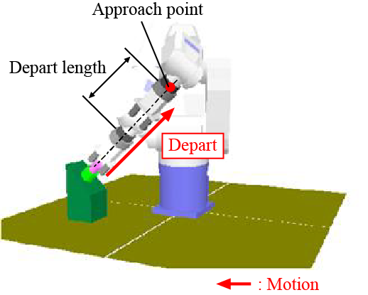 Since it is difficult to figure out the depart and approach positions manually, Approach command and Depart command are prepared to calculate these positions automatically.