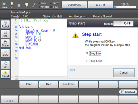 To execute a step start of the next line, press OK for a while with holding down the deadman switch.