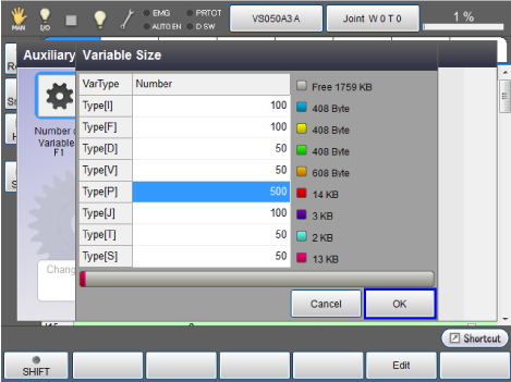 | [F12 Aux] | Display [Menu] window. Select [Number of Variables] in [Menu] to display [Variable Size] window. Select variables to change the variable size, and press [F4 Edit]. Then, ten key will be displayed. Enter the setting value with ten key, and press [OK] on the ten key to change the variable size. |