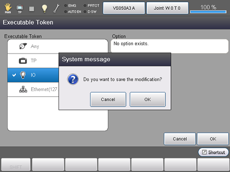 If the executable token is held by teach pendant, set the executive token to I/O in the following way.O.