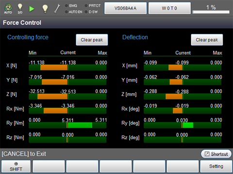 | "Controlling force" | Displays the amount of force used to control the robot (external forced applied + force required to control the robot without any external force applied) based on the encoder values. Values are displayed by position and posture. |