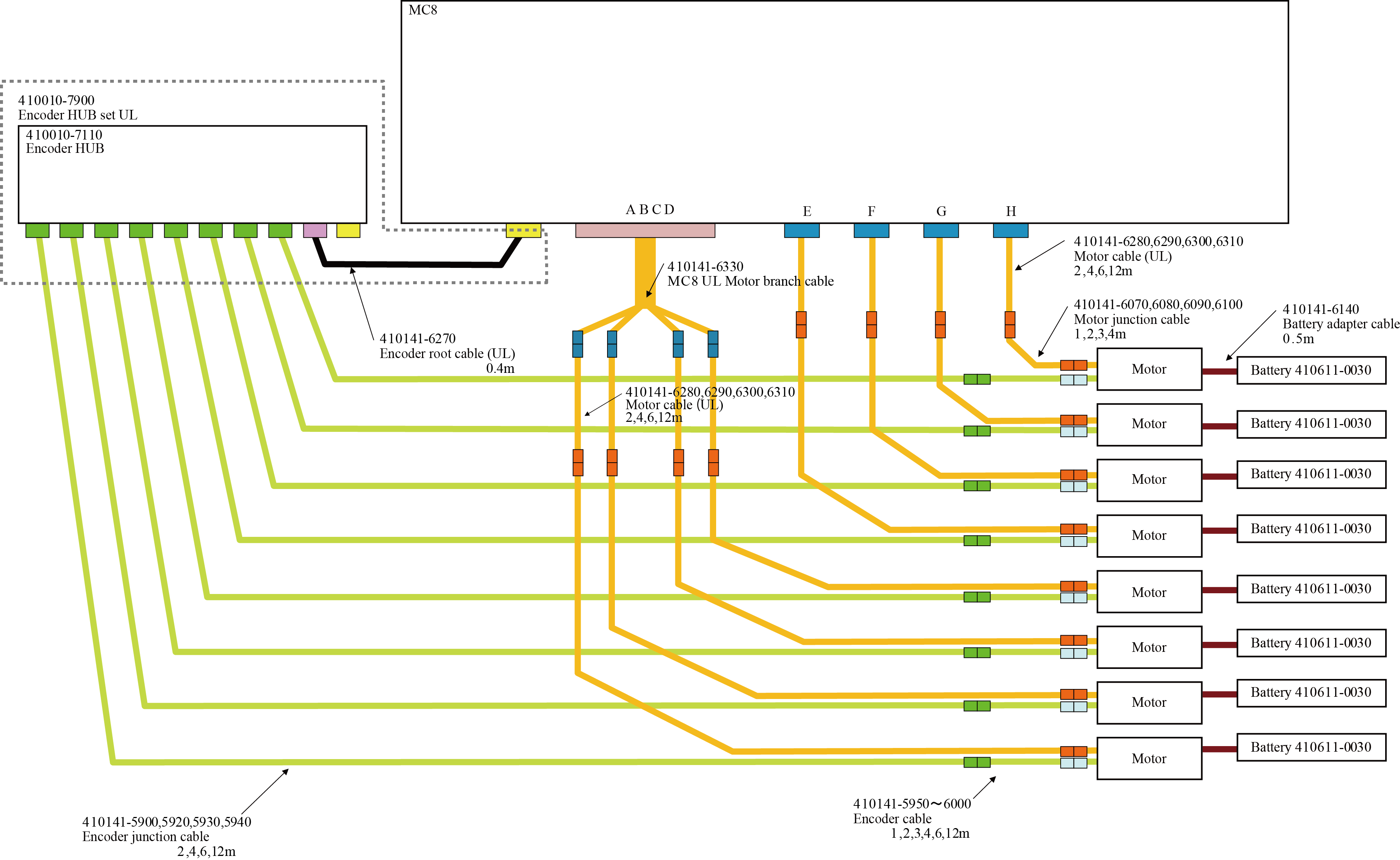 Connect motor cables with motor connectors on the MC8 directly, as shown below. Encoder cables are connected to the MC8 through the encoder HUB.