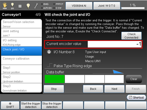 Operate the conveyor then check whether the value of [Current encoder value] changes properly.