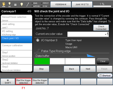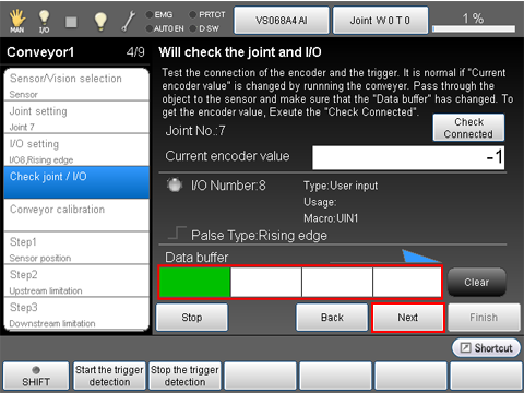 Place a work piece on the conveyor to pass through the sensor, and then check whether the value of the [Data buffer] changes properly.