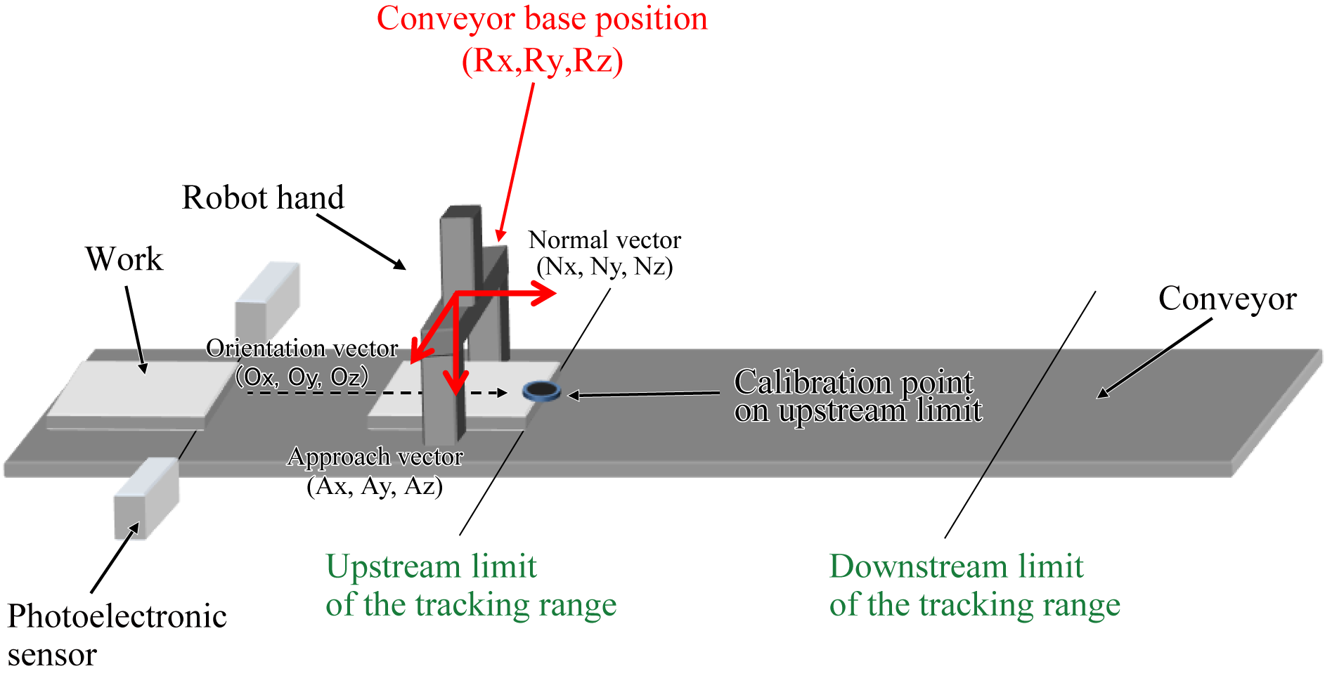 | Upstream limit of the Tracking range | Once a work piece passes this limit, a robot starts the conveyor catch-up motion. [mm] |