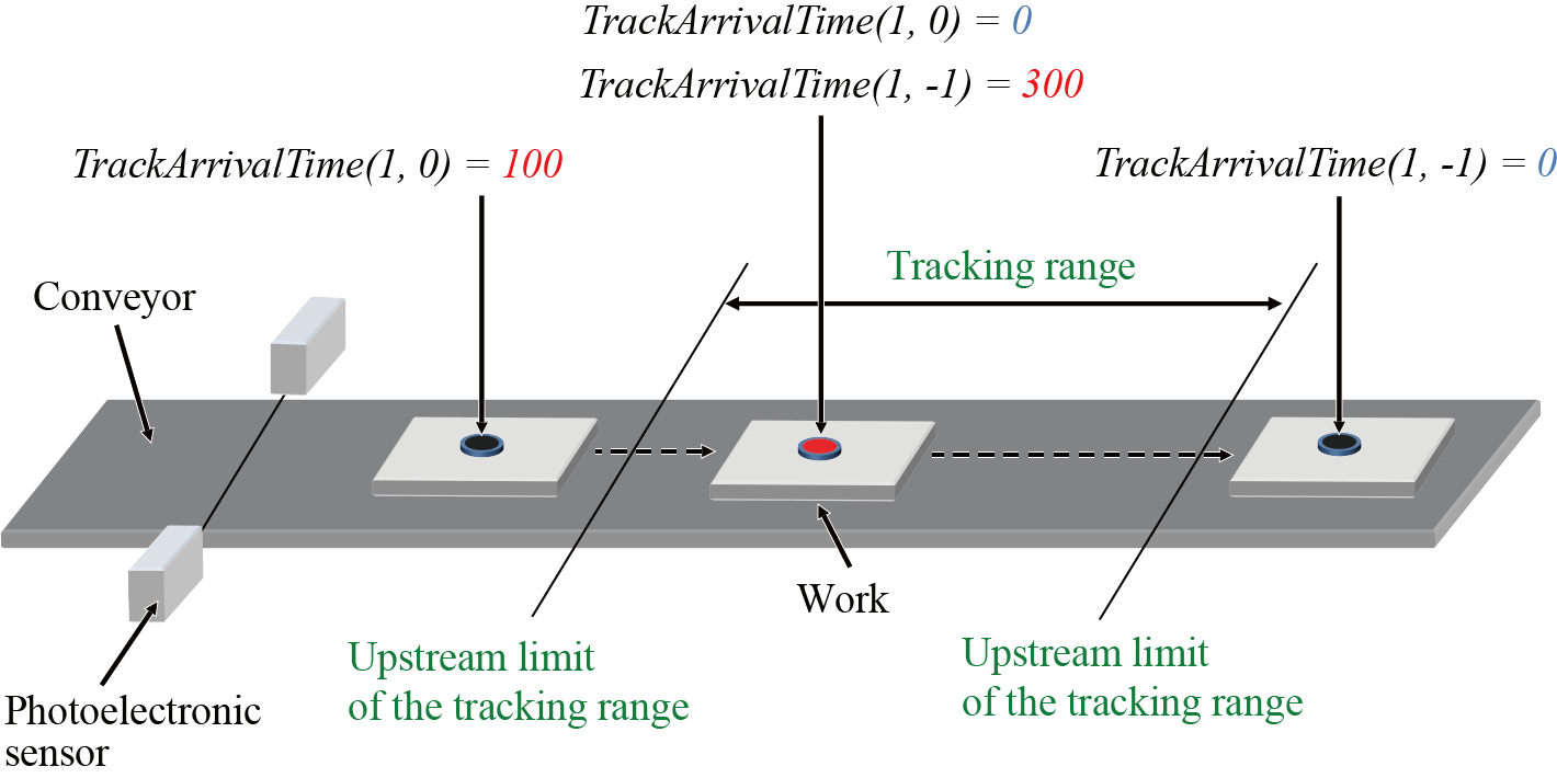 TrackArrivalTime (Conveyor number [, Specify upstream limit/downstream limit[, Offset value]])