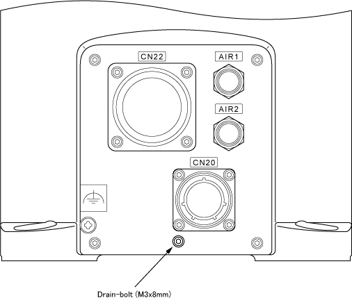 For the dust- & splash-proof type of robot units, the drain-bolt (M3 x 8 mm) is screwed onto the rear side of the robot unit as shown in the figure below. At the floor-mount installation, remove the drain-bolt shown in the figure below, before installing the robot unit. It will become a drain-hole for the liquid.