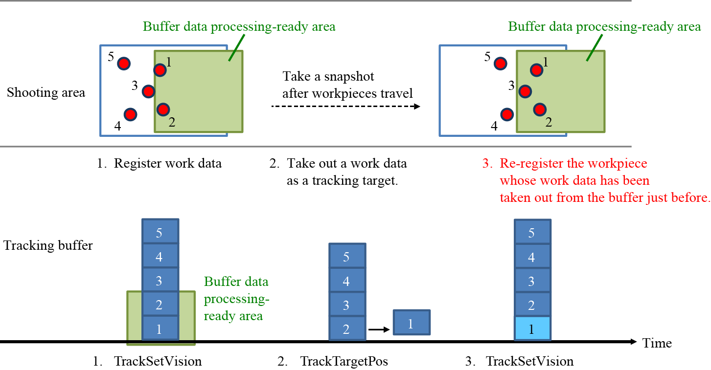 Registration overlapping prevention function, which prevents multiple registration of an identical workpiece, is set by the parameter setting of “Minimum interval length of work detection”. This function is effective only when the target workpiece has already existed within the tracking buffer area.