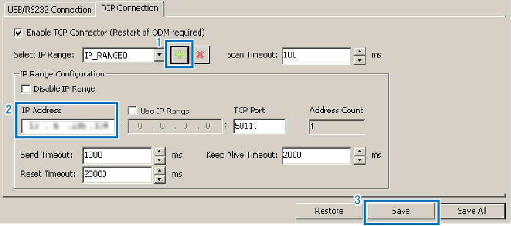 On the [TCP Connection] tab, click [+] button which is indicated by "1" in the image below, and then enter IP address in the box indicated by "2", and then click [Save] button indicated by"3".