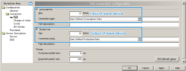 Select a connection method for slave device connection from ; Poll connection, Change Of state connection, Cyclic connection, and Bit-Strobe connection. A connection method that is not supported by the device will be gray color and it will not be selectable.