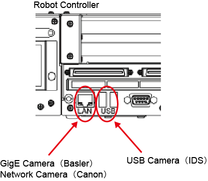 Basler GigE camera or Canon Network camera: Connect the camera to a LAN port of the robot controller through a hub when you setup. When you use the camera, directly connect the camera to the LAN port of the robot controller.
