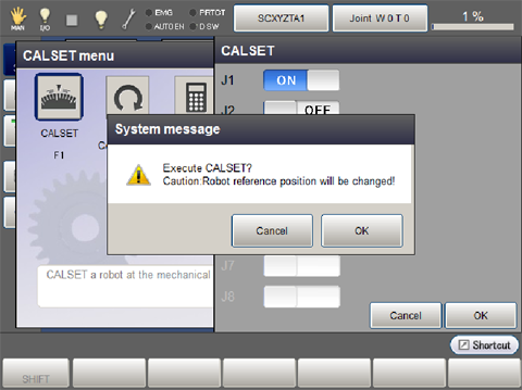 Select [ON] or [OFF] of the CALSET target axis and press [OK]. A system message for confirmation appears.