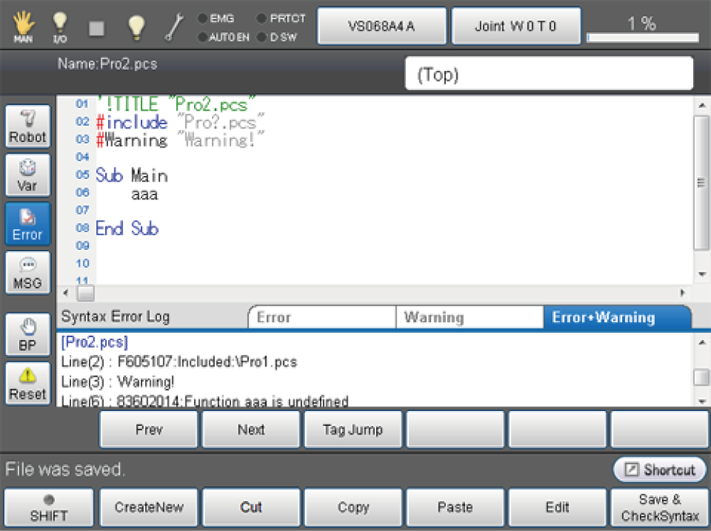 | Error + Warning | Both error and warning are displayed. This is the default setting. The syntax error log information will be the default setting in the following conditions.