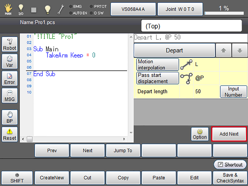 | J | Option button | Display the options when [Add Next] is selected with the Approach or Move command.Select from the following three and press the [OK] button.