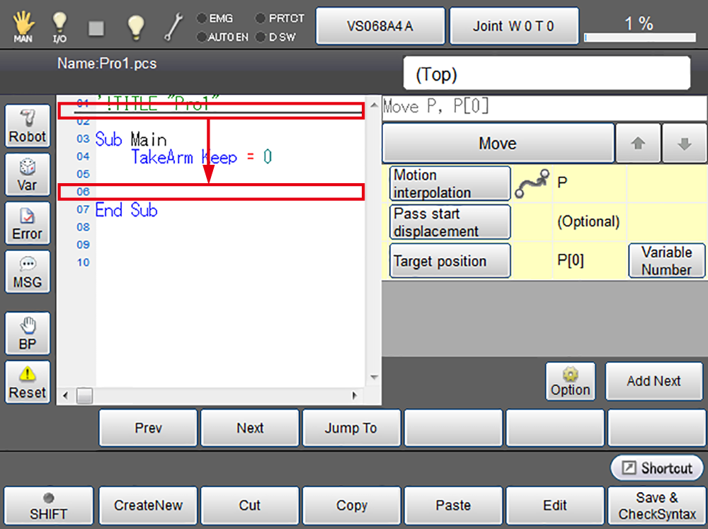 Select a line where you will insert a command. Move the command adding cursor in the sixth line of the program. To move the cursor, touch the screen directly, or use the up-and-down-arrow keys, or the jog dial.