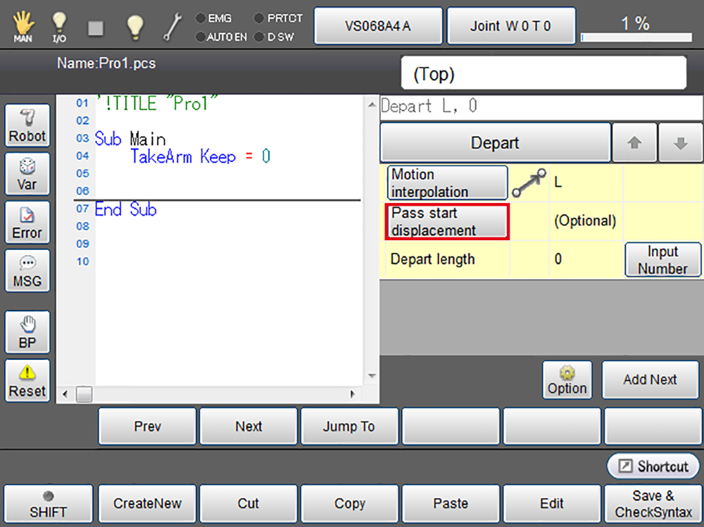 Set the distance of pass start displacement. Press [Pass start displacement] button.