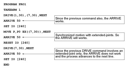 ARRIVE takes effect only for robot joints. Therefore, when operating only extended-joints by DRIVE or DRIVEA, this ARRIVE command does not work.